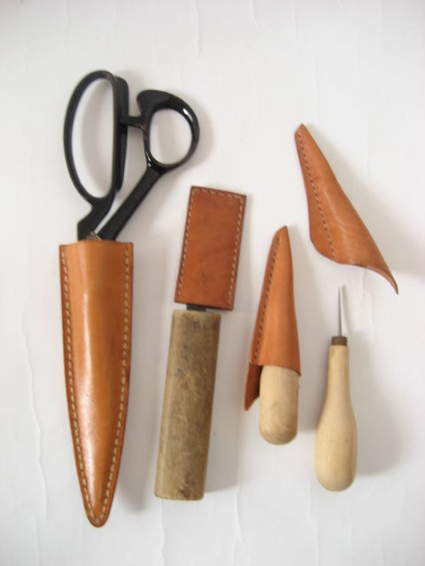 ゴムグリップ専用の革キャップが完成し、そのきっかけになったお客様から、大変感動しましたという素敵なメールをいただき胸が熱くなったのですが、そのとき「あぁ、そういえば私が一番最初に作り方を教わったのは、手縫いの包丁入れだった」と思い出しました。今でも使っているものですが、包丁入れができたからハサミ入れ、そして目打ちキャップと発展させていきました。
