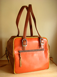 身ごろに深いオレンジ、マチにジェノバブラウン。玉ぶちのパイピングにイエローをあわせたバイカラーです。