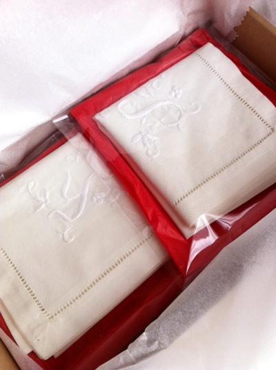 手刺繍イニシャルハンカチのギフトたち。複数枚のオーダーがとても多いので、ギフトの場合はつぶれないように箱にいれてお届けしています。今日もお送りしますよー